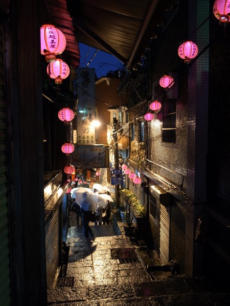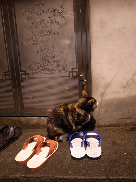 で、ブラブラ急階段を下りながらヨソの日本語ガイドさんの説明を横聞きしてフムフムと納得したりしたり(もともと提灯が飾ってあったのはここまでだったけれども観光地として人を呼ぶために政府がお金を出してここから先にも提灯をつけたとかそんな話)写真を撮ったり猫を追い回して写真を撮ったり犬を追い回して写真を撮ったりそんな姿を他の観光客に不審がられたりしているうちに……なんか人影がまばらになってきました。時刻は午後7時前。