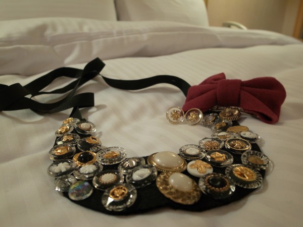 とか言いながら、1,000円均一風情のベルトを300円ほどで二本ゲット。流行ものはこのくらいのもので上等です。あと、韓国アパレルを扱ってるお店でこれは店のオリジナル、と言われたアクセサリーを。ヴィンテージのボタン使ったピアスとネックレスでかわいい~。