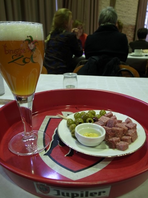 ビールは今度はブリュージュのやつです。最初、ビールしかないかと思ったのだけれど、メニューは読めなかったんだが、カウンターの中にオリーブの入ったタッパーが見えたので、オリーブも欲しい~とか言ったらオッケーつって、そんでサラミは?ってきかれたのでいるいる~とか言ったらこうなりました。