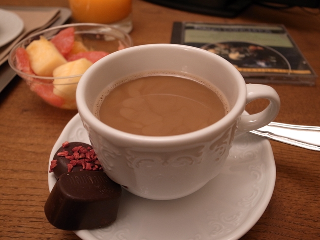 昨晩買ったノイハウスのチョコレートをいっしょにいただきます。パジャマのまま部屋でだらだら飲食できるルームサービスのしあわせよ……。しかしルームサービスのメニューがないと言うことは値段が分からぬと言う恐ろしさよ……(*)。