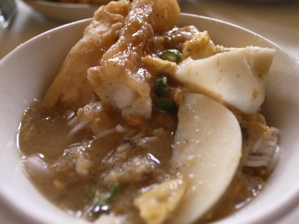 焼いた茄子を冷やしたものでまさに焼き茄子。しかしここにかけるのは醤油やポン酢ではない。ものすごい油たっぷりのこってりしたドレッシングのようなものをたんまりかけた上に、砕いたピーナッツで駄目押し!どんだけ油摂るの!?それとおかわりねーさん何回も来るんだけどみんなどんだけ米食うの!?ちなみにお米は細長いけど案外おいしいです。