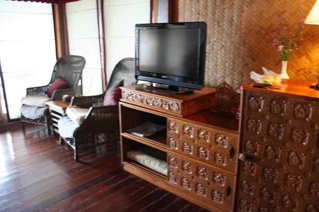 ちょこちょこお花が飾ってあったりしてなかなか気が利いています。テレビも大きい液晶だ!