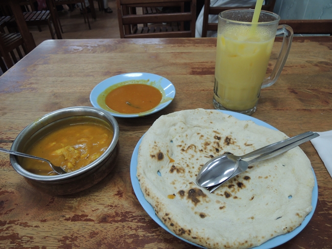 がまあ、カレーを食べよう暑いときでもとりあえずカレーは食えると、メニューを眺め、給仕のおいちゃんが「これはそんなにホットじゃないマイルドだ」って言ってくれたチキンのカレーとナンとマンゴーラッシー(大)を頼む。これでRM17.5。やっぱ安いわ~。しかも、うんまい!!