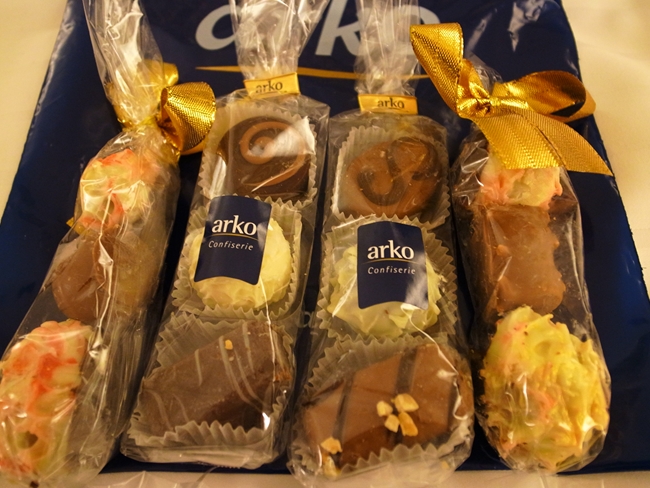 arkoというチェコのメーカーのようです。予め缶や箱に入ったもの、プラハの名所の包み紙のタブレットチョコ、焼き菓子などもあり。もちろんショーケースから1ピースずつ選んで買うも良し。これらはレジの横に積み上げてあったついでにいかが的プチギフト。