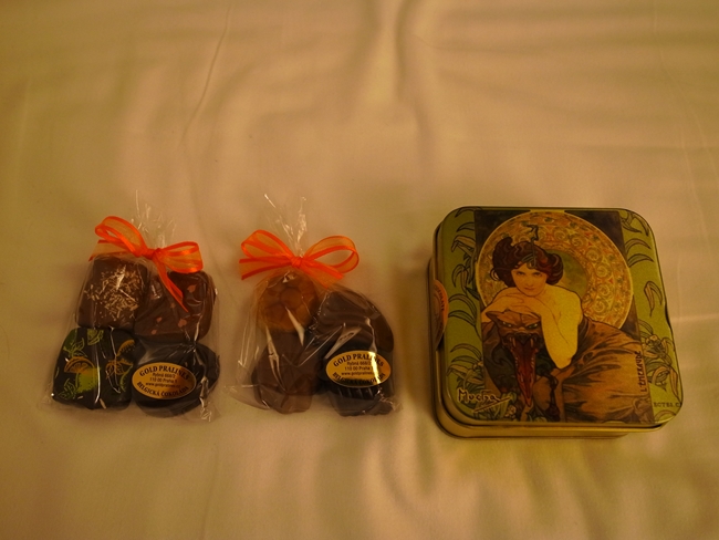 Orionてのがスーパーで買えるチェコのお菓子の会社って歩き方で見て、会社用に買いました。申し訳ないくらい安いが(たぶん1箱300-400円)箱もきれいでおいしかった。でも後でじっくり箱を見ていたらネスレ傘下のようである。