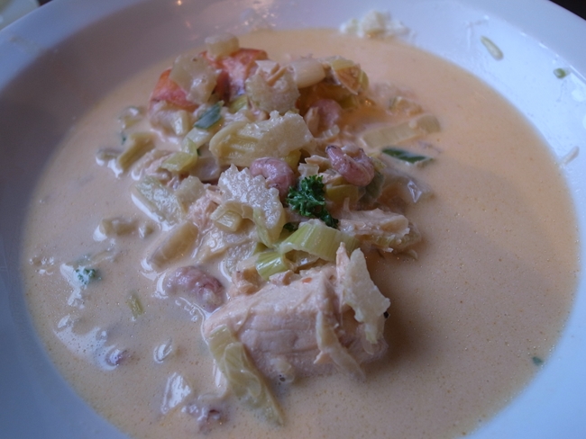 ワーテルゾーイは見た目シチューのようですが、もっとスープはさらっとした感じです。細かく刻んだ野菜や香草がたっぷり入っていて、メインのチキンやシーフードなどの具は大きいのがゴロゴロ入っています。ニンニクの風味もすごくあるのですが、香草やセロリたっぷりなのでとても爽やかな味わいです。