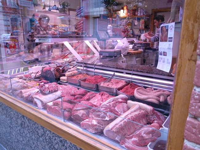 これは、広場に向かうBlaes通りにあったお肉屋さん。お肉いっぱい~。