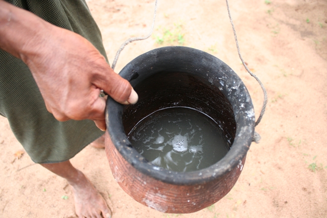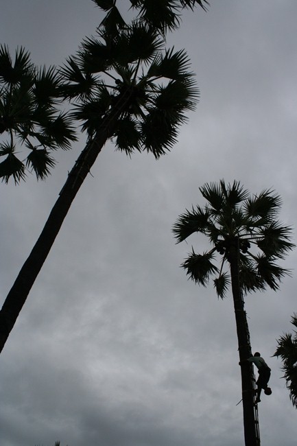 ①ヤシの木に傷をつけて垂れてくる樹液を受ける壷を仕込む(ヤシの木に人が登って行う)