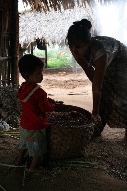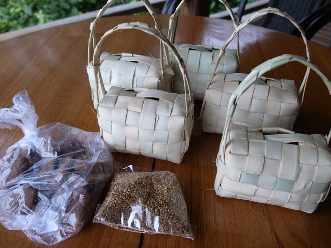 そんな話とかしながらのんびりしていると、おばちゃんからヤシの葉で編んだ小さいバッグみたいなカゴと袋に入った炒りごまを渡される。ガイドさん経由で「お土産にあげる」ときく。小さいカゴバックにはヤシ砂糖が入っている。うわぁーありがとうございますぅー!!とか日本語で言うてどうすんねん!!でもまあ雰囲気は伝わった模様。