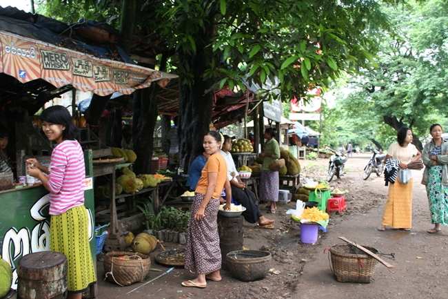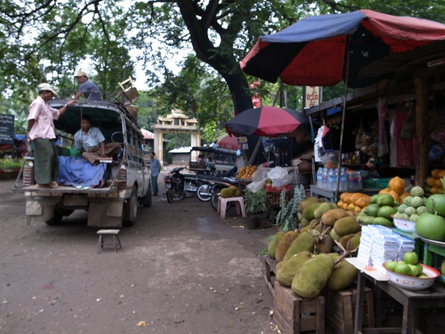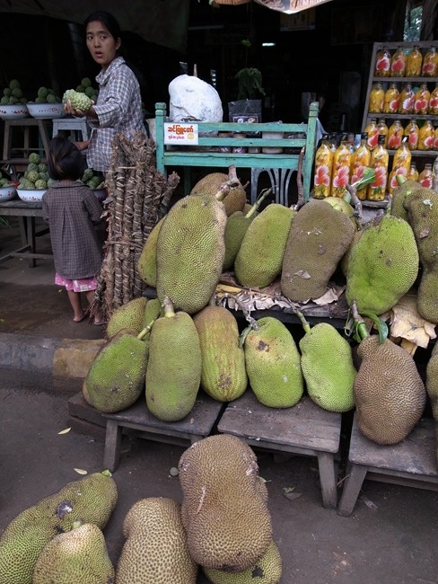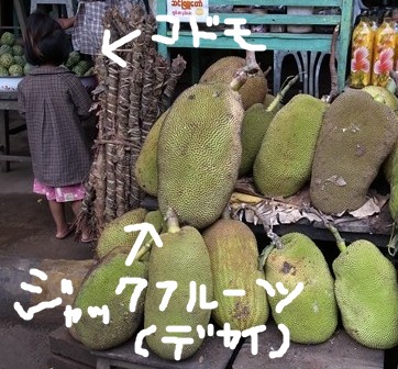 この緑色の割とグロい感じの物体を割ると中に薄黄色の房がいっぱい詰まっていてその中に大きい種がひとつずつ入っています。熟すとこの房が甘くてとてもいいにおいがするそうな。へぇ~。後にスリランカで聞いたところによると、熟す前には実は食べられないけど種が少し柔らかく炒め物やカレーに使うとの事だった。へぇ~。スリランカでもジャックフルーツ食べたくてガイドさんにリクエストしていたので、ガイドさんが車走らせながら露店をチェックしてくれたけど見つかりませんでした。その後、最近ベトナムの市場で念願のジャックフルーツをゲットしましたが水分が少なく今ひとつでした。ミャンマーで食べたのはおいしかったよ……。雨季だし丁度旬ではあったからなんだろうが。