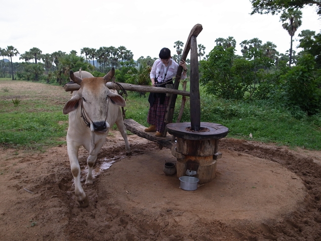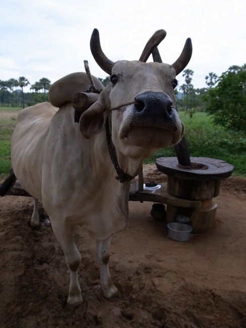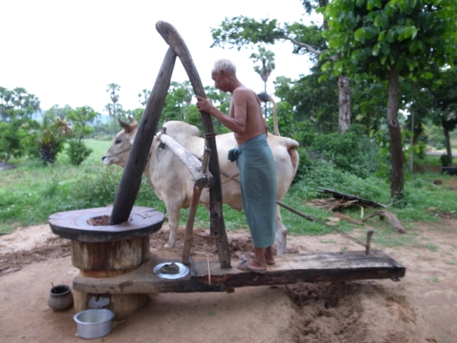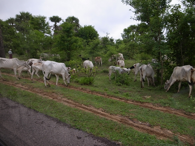 バガンでは主にマメを作ったりヤシからオイルや砂糖やお酒を作ったりが主な産業だそうで、豆畑と合間にヤシの木、そんで牛さん(たぶん働き牛)がブラブラ……と言う光景が続きます。
