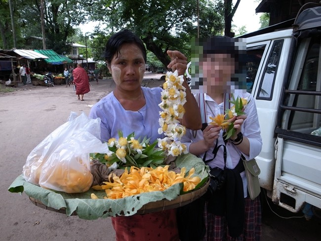 ガイドさんがお花を買ってくれました。このあたりは激安価格なので小額紙幣を持ち合わせていない外国人にはなかなか買いづらいものがあります(こちら参照)。あと、ジャックフルーツの房を幾つかずつビニール袋にパックして売っているのを買ってくれました。