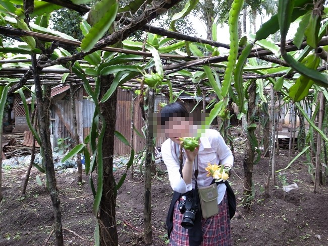 そんで、じゃあジャックフルーツが生っているところを見せてくれると言ってずんずんと少し集落の外れへ。適当なお宅を見繕って表にいる人に声をかけ裏の果樹園へゴゥ!後で別のときにきいたんだけど、本当にノーアポイントメントだそうで、そのときどき目に付いた人に声をかけているらしいですが、断られたことはナッシンだそうです。