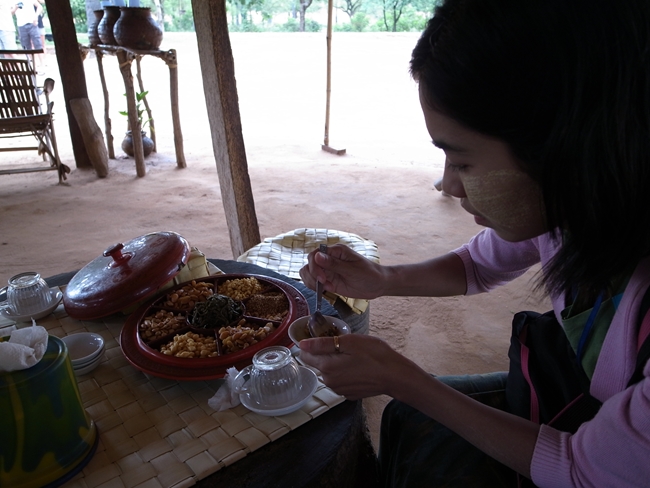 ミャンマーでは代表的なお茶請け、お茶っぱを発酵させたものにナッツ類を混ぜた「ラペソー」をいただきます。お茶の苦味がほのかにありにんにくなんかもきいているのでスパイシーでおいしい。ガイドさんに「どうですか~?」と聞かれたので、「おいしいです。でも日本人的にはお茶請けって言うよりおつまみっぽいです。」と答える。そう言った日本人は私だけではないらしく、日本人のおいちゃんたちの中にはこれがとても気に入る人が結構いらっしゃるそうな。