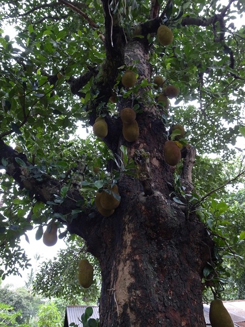 なにか木の幹に別の植物が寄生しているかのごとくジャックフルーツがぼこぼこと生っています。コレ、最初に食べてみようと思った人、結構すごいと思うんですけどね。