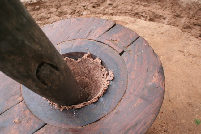 べぇ子さんにぐるぐる歩いていただいて、したらばべぇ子さんがつないである心棒がぐるぐるまわってその下に入っている落花生がどんどんつぶされて油が絞られると言う簡素な仕組みです。べぇ子さんがサボったりしないよう、おいちゃんが一緒に装置の上でぐるぐるしています。