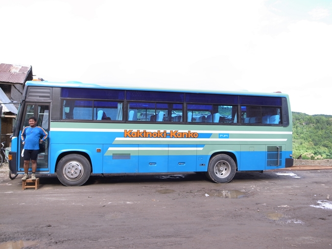 写真はいたって無意味に途中で見かけたバス。観光用に使われている元日本の観光バスです。どこの会社だろうね、「かきのき観光」。途中までは来た道を通って、しばらくして道が変わる。しかし基本、建物とかなにもないんで方向音痴のひとをここに置き去ったら絶対戻ってこれなくなるだろうなあ。広域の地図をきちんと見ていないのでよく分からないまま、車で運ばれて行きます。