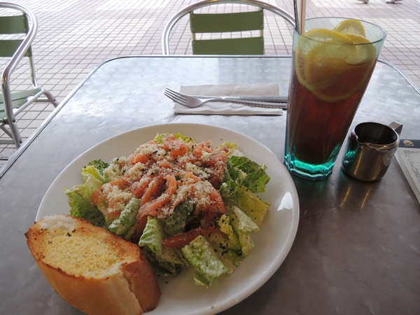 かなり悩みながらぱらぱらぱらぱら何度もメニューを見て「スモークサーモンのシーザードレッシングサラダのガーリックトースト添え」に心惹かれたので、それとアイスレモンティーを頼みました。これで116ドルとかなのでちょっとお高い店だねこりゃあ。
