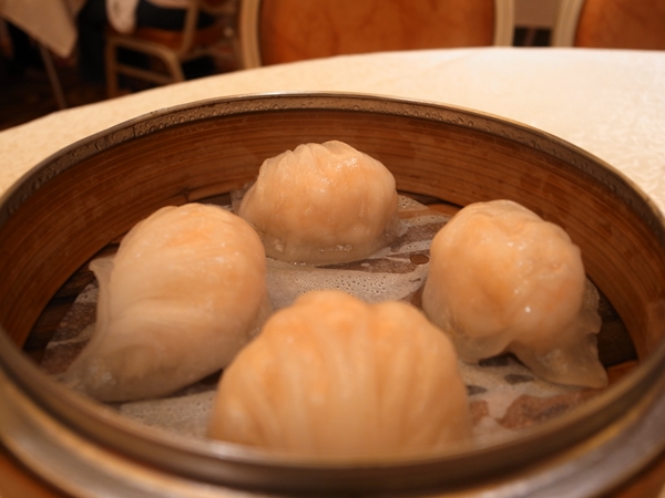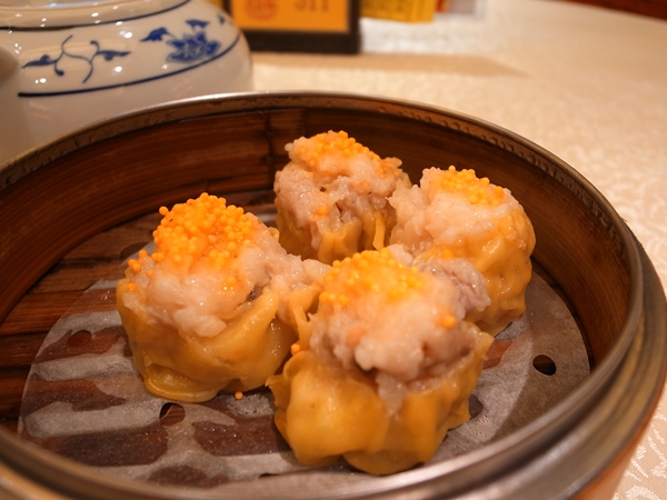 なんかぬもーんとしているフカヒレの蒸し餃子は見た目が気になりましたが結構イケる。うんうん。でもフカヒレ!と言う目玉が無かったらわざわざ食べないかな。フカヒレの入ったとろーんとした餡が中にたっぷり詰まってました。で。エビちゃんが透けて見える海老蒸し焼売。これはプリプリ!海老たっぷり!うれしいね!いちばんおいしかったのは蟹の卵の乗っている焼売でした。見た目もいかにも華があるし。