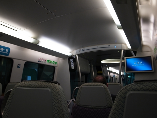 便数も多く10分おきくらいに来るので大体の時間で動いたので良いですし。車内はとてもきれいでゆったり。アナウンスがきちんと入り、最終の空港では両方の扉が開いて、どちらの扉がどのターミナルと言うのがアナウンスだけでなく前の液晶モニターにも表示されました。ホームの中央付近から乗ったので、降りたときも降りてまっすぐ100mも歩いたら出発ロビーでした。これはらくだわー。(何回ラクって言うんだ!?香港鉄路有限公司の回し者ではないス!!)