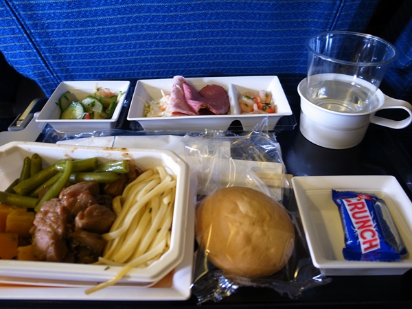 機内食はメモによると、スモークサーモンサラダ・海老マリネ・ローストビーフ・ポークシチュー(なんか得体の知れないヌードル付き)・パン・お菓子。昨日しこたま食ったぜスモークサーモン……と思いつついただきました。夕食代わりにするつもりだったのでおいしく完食。