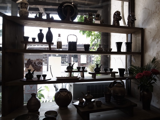 窯元の販売店だったのでじぶんとこのを売ってる感じ。伝統的な技法を使いつつ、モダンな形=実用的な器もあったりなかなかいい感じ。シーサーもありました。型で作るタイプのものでしたが、型はなんかすごい先代の職人が作った型を使ってますなんてアピール。