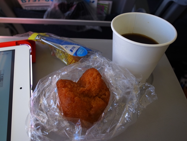 帰りの飛行機でコーヒーを貰い、うきうきとさっき菓子屋で買ったサーターアンダギーを出していたら、CAさんがおしぼりをくれました。親切。