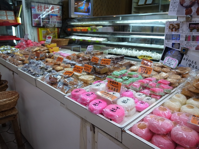 お店はベタなお土産物屋さんから、やや専門的な食品寄りのお土産物屋さん、どちらかと言うと観光客向けの雑貨屋に混じり、ドラッグストアや中高年向けの洋品店や、寝具店、着物や伝統衣装のお店なんかも混じったカオス。