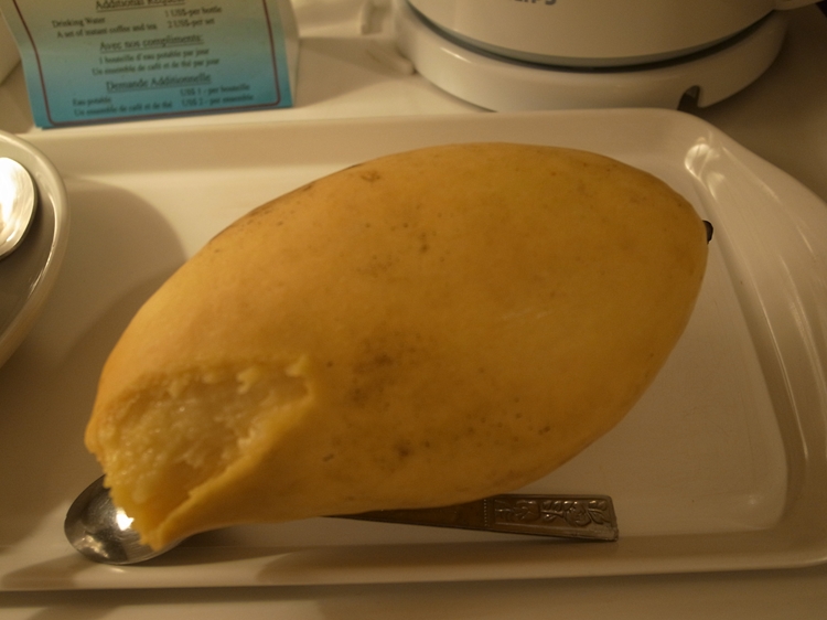 部屋に戻っておなかは空かないけど水だけだとちょっとなあ……あ、そういやマンゴーがあった!と言うわけで本日の晩ごはん(?)はマンゴーひとつ。皮は柔らかかったのでナイフ無かったけど備え付けのフォークの柄を当てて無理矢理剥いた。