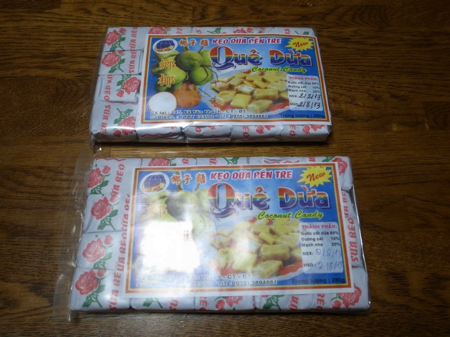 メコン川ツアーの途中の「ココナッツキャンディ工場」でまんまと買う。イヤ作りたてを試食させて貰ったら案外おいしくて……ひとつ30,000ドン。でもまあひとによったら作ってるところ見たら食べられないかもね!