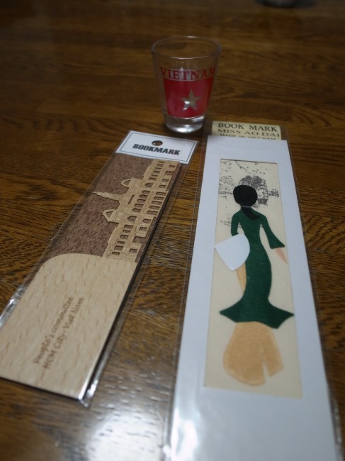 ショットグラス1ドル、木のしおり2ドル(人民委員会のかたち)、アオザイのねーさんのしおり1ドル。1ドル=21,000ドンで精算。