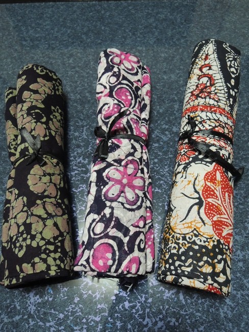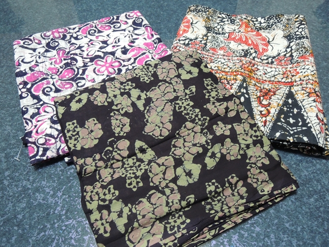 ボイルコットンのパレオサイズを二枚だけ買うつもりだったのですが(丸めた写真で左の二つ)、店員さんがハリのある生地のもののほうがプリントはよい品だ、もう在庫限りしかない、とやたらにお勧めするのでそれも買いました。三つでRM213。