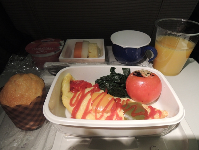 朝食はこんな感じ。JALなんだけど「いかにもマレーシアで調達した機内食メニュー」感が漂っているように思えるのは私だけか……。