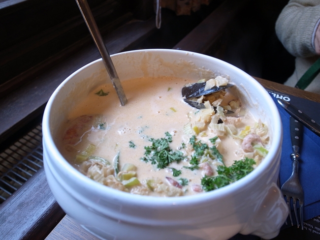 お目当てのワーテルゾーイはチキンと魚介のものと二種類がありました。そのどちらかと、折角シーズンだし本場だし、シカか何かそういうワイルドなお肉をいただこうかと思ったのですが、母の反対を食らい(「ひとりで食べるんならいいよ」ってひどいよ!わたしだってワーテルゾーイも食べたいからシェアしたいじゃない!)、もうじゃあチキンと魚介のワーテルゾーイをひとつずつオーダーしました。
