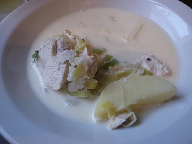 ワーテルゾーイは見た目シチューのようですが、もっとスープはさらっとした感じです。細かく刻んだ野菜や香草がたっぷり入っていて、メインのチキンやシーフードなどの具は大きいのがゴロゴロ入っています。ニンニクの風味もすごくあるのですが、香草やセロリたっぷりなのでとても爽やかな味わいです。