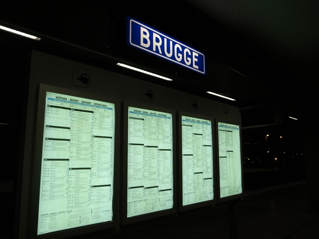 こんな感じで、各駅列車でも席はゆったりでございます~。そうこうしているうちに比較的大きな駅で、長いホームの端にBRUGGEの文字をハケーン!!慌てて出口に向かい無事降りることに成功しました!