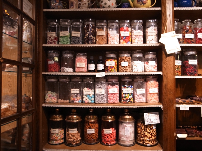 レジの後ろの量り売りのお菓子のびんたちが……他にケーキとか、個包装のアメちゃんなんかもありました。パウンドケーキみたいのが2-4ユーロで、同じようなケーキがブリュッセルのヴィタメールだと10ユーロくらいしたので、街のお菓子屋さんって感じの店だと思う。