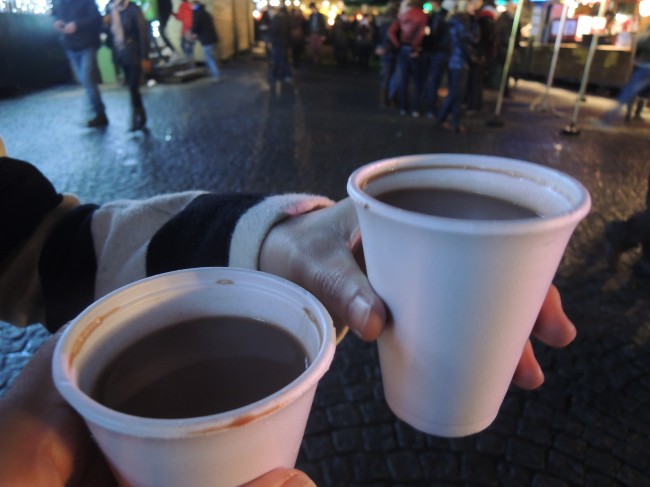 ベルギーだしー、甘いものも欲しいしーってことでホットチョコレート2ユーロ。ホットワインとホットチョコレートはもういたるところで売っていました。