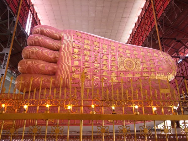 寝釈迦仏には寝ているだけのものとお釈迦様が入滅したときのものと両方あって、違いは足となんかあった気がするけど足の方しか覚えとらん、死んでるお釈迦様は足が揃ってて足の裏には何も描かれていないってことなのでこのお釈迦様は寝ているだけのお釈迦様。この足指一本とっても私よりデカイという半端無いデカさです。