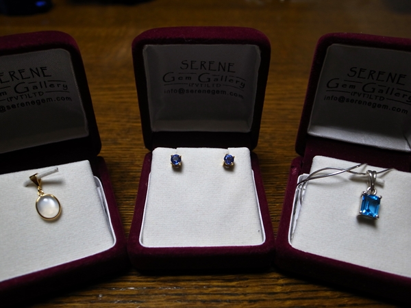 これは別のお店で、まんなかのピアスだけ私の、後は家族が買ったお土産。このへんはお値段かわいくてお得だったよ。私のピアス14,000円くらいで、薄めだけどきれいな色のサファイヤに地金は無駄にごっつい18K、地金減らして値段下げてくれ(笑)!日本だと0.1ctでほっそい18Kピアスとかでもいちまんえんくらい取ってくるんでこれはまあお得かと思う。少々騙されてても気にならない値段だし。お店で見てるときはかなりのマイクロサイズに見えたけど家でつけてみたら殊の外デカかった。
