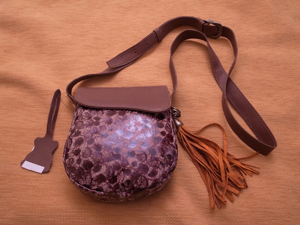 このポシェットは50ユーロ。ふたはマグネットで閉まって、内側にはファスナーポケットとオープンポケットがあって、軽くて肩にかけたときの収まりもいい。