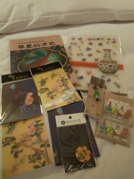 展示物の陶磁器をモチーフにしたクリップがかわいかったので買いました。150元……450円くらいかな?あと、気に入ったちょうちょの壺のクリアファイルとか角度変えると模様の変わるカードとか。そんで、まったく読めないけど、恐らく陶磁器中心のものであろうと思われる図録を一冊。カラーの割に安かったと思うけど、正確なお値段は覚えておらず。まあ白菜のストラップはお約束。つってもiPhoneにはストラップつけられないけど。