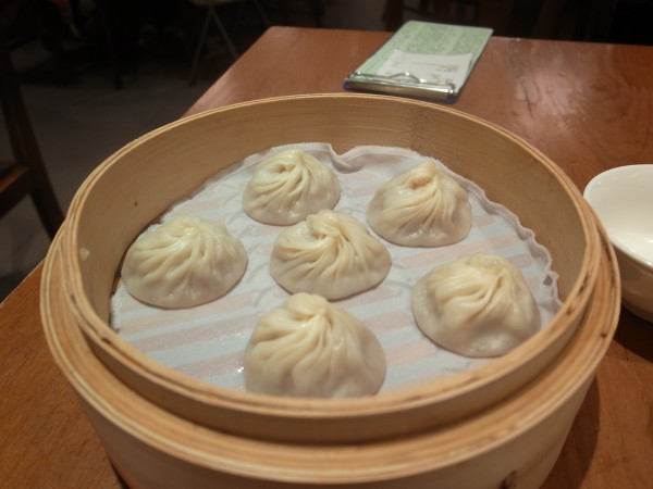 まあ、基本最低でも2-3人で来ることを想定している店だから仕方ないか……。その上、おひとり様用セットを蹴ったのは自分。これはがんばっていただかねばなりません。うん、スープは普通においしい。トマトが入ってたのは意外だけどおいしいな。そのうち問題の小龍包もやってきました。いっただきまーす!