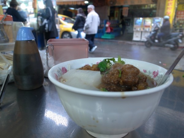 これはちなみに110元なり。ちなみに見た目に反してあっさり系ですよ、この方。おだしがきいていておいしい系の。後、見た目ほどボリューミーではありませんので、小腹を満たす系もしくは呑みの締め系的な存在に感じました。外テーブルなので温かさもここちよい。箸休め的な存在なのか、スープのしみていない茹でただけの大根が添えられていましたがこれもうまし。ズルズルと完食しました。