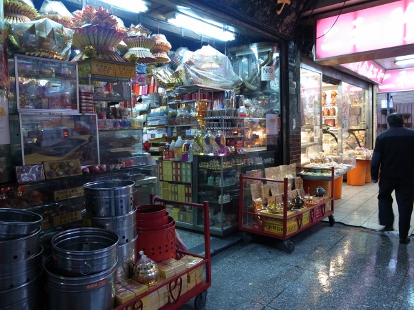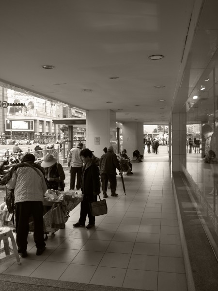 こういうふうに固定的でお店を構えているおばちゃんと、手持ちで売り歩くおばちゃんとが居ました。売っているのはお線香にお花にお菓子など。写真のおばちゃんたちが店を構えている目の前のテナントには超モダンで若者向けっぽい(ヤング~キャリアくらい?)洋服屋です。しかも結構大きい。おばちゃんの前には外国人モデルがワケ分からんポーズで格好付けてるポスターがウインドウ全面に貼ってあったりするわけなんです。……なんかこういう混沌さ?或いは共存?ってなんか好きだなあ。