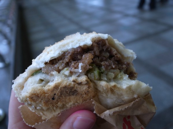 見よ、溢れる肉汁!!!!皮がぱりぱり固めの中華まんみたいな。パン寄りの感じの皮にぴりっと胡椒で味付けされたジューシーなお肉とネギがたっぷりー。