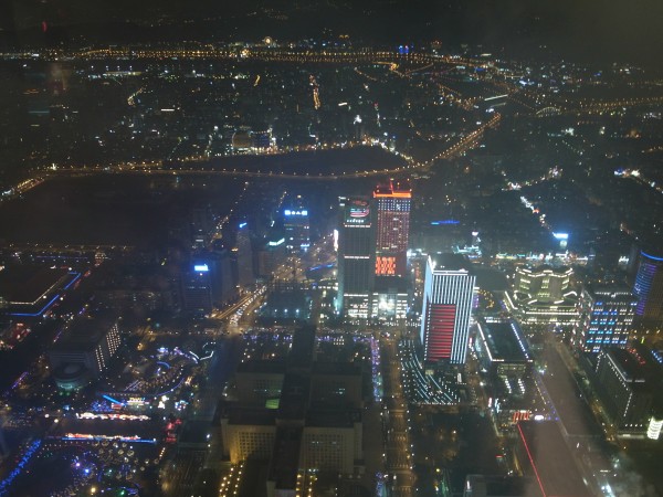 では早速、世界最速のエレベーターとやらへ……世界最速だけにあっという間に展望台へ着いてしまいました。なんか数カ国語で簡単な説明が流れてる間にすいっと。耳抜きしたくなる感じ……。さあ、肝心の夜景は……
