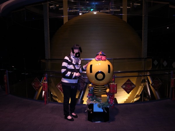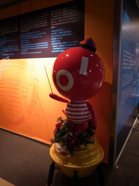 実際、こういう高いビルって最近のはどうかしんないけど、昔のだと常に微妙にユラユラしてんのが中でも分かったりするじゃないですか。しかし台北101は全然ユラユラしませんですハイ。振り子が代わりにユラユラしてビル自体は揺れないと言う、ざっくり言うとそんな感じ。で、彼?(→)はこの振り子をモチーフに、目口は「101」の文字で表現されているというワケです。