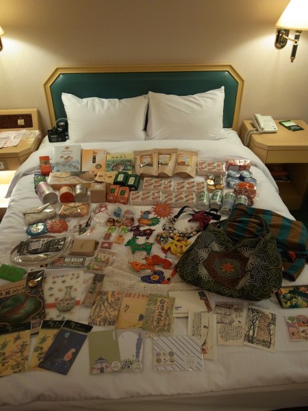 で、帰ってそのまますぐ寝ればよかったのに、ホテルでアホなひとり遊びをしてしまいました。買ったものの写真を撮ると言う、ひとり遊びを。その写真がこのブログに貼られているワケです……。どうせだからと全部広げていっぺんに撮ってみたらこう↓。