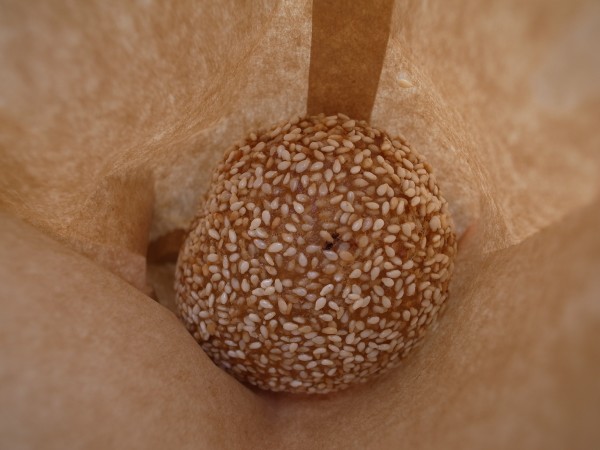 おばちゃんに指差しで「コレひとつください」。大きなゴマ団子のようなものを買いました。ひとつ15元なり。看板にすべて書いてあったので買いやすかった。